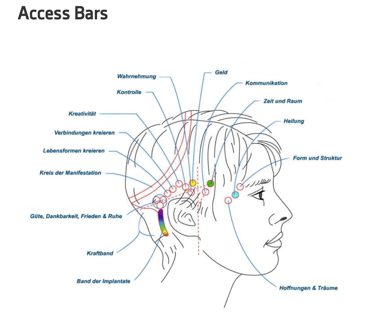 Die Access Bars sind 32 Punkte am Kopf, in denen alle Gedanken, Gewohnheiten, Verhaltensmuster und Glaubensätze, Überzeugungen, Überlegungen, Bewertungen und Emotionen zu verschiedenen Lebensbereichen gespeichert sind. Durch sanfte Berührung dieser Punkte beginnen sich diese Einschränkungen mit erstaunlicher Leichtigkeit aufzulösen.